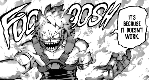 Tetsutetsu can now withstand more extreme temperatures thanks to his training, nice. A great way to distinguish himself from Kirishima. You know, I like where this is going, having Tetsutetsu be the elemental tank and Kirishima the physical tank. Good move, Hirokoshi!