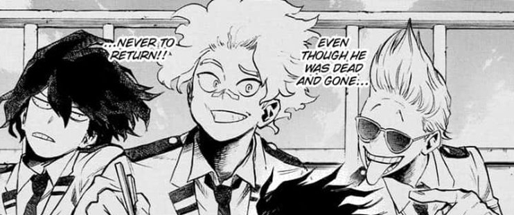 As I said time and time again, nothing good can come from Hawks looking for the Nomu and Ujiko. Well, yeah, there’s finding out where the Nomu are made and Ujiko’s secret identity but it’ll be a great cost. Basically, Hawks may not be alive much longer y’all. But, hey, we’ve seen heroes dodge death flags before (Looking at you Toshinori and Endeavor.), so it’s not impossible he’ll survive, just less and less likely.