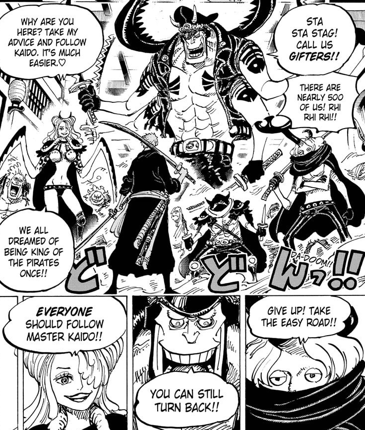 So, Kaido’s in it to win it. With the Seven Warlords disbanded and replaced with something stronger (Tik Tok dancers?), Kaido decides he’s not gonna wait around for the popo to take him out. Oh, no! Instead, he and Big Mom are teaming up to find the ancient weapons and One Piece. Banking on with them and their combined might, even the Navy and World Government can’t stand in their way. See, Orochi? It wasn’t personal. Kaido just wanted to destroy your country and turn it into a permanent Spring Break with weapons. I’m sure you understand.