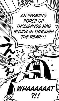 Perospero. Doesn’t look like he’s fighting Marco. Guess he was serious about focusing on killing Luffy. If so, it still doesn’t make sense they aren’t fighting. I guess Marco could be chasing Perospero, but since when was Perospero a fast character? Eh, I don’t know what’s going on there.