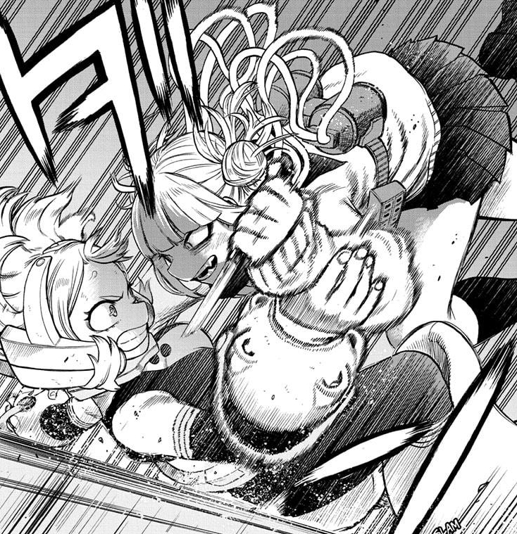 Toga VS Ochaco. Who wins? Gigantomachia, naturally. They’re in his path so I’m betting their fight will be interrupted. But, that’s not the point. Toga wants to know if Ochaco, Tsuyu, and Deku are gonna try to kill her just because she’s a murdering psychopath. Those judgmental bastards! Anyways, I’m not sure where Horikoshi is going with this plot. Mostly because Toga is kinda cray-cray so it’s hard to know how she’ll react, but my guess is it won’t be good for the heroes.