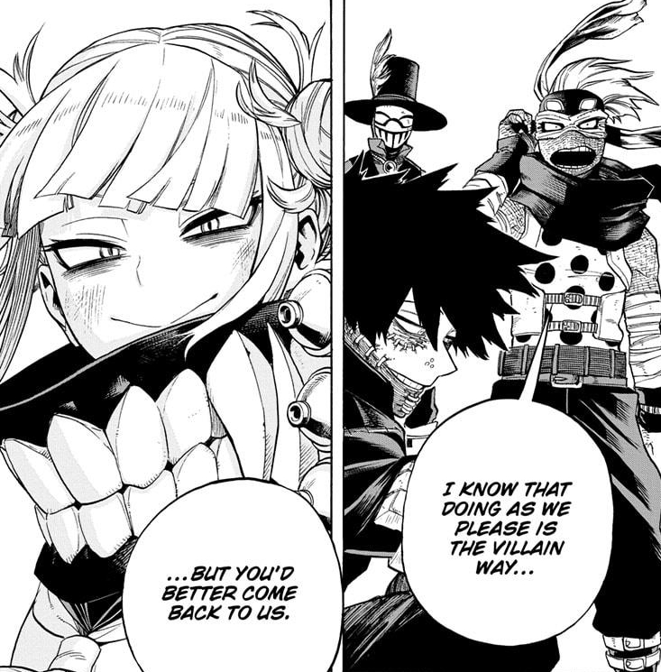 What exactly does he want Skeptic to do? Whatever it is he’s as happy as kid in a CBD candy store. For me, that brings it down to two options: It’s Endeavor related or Stain related. Dabi mentioned Endeavor before so maybe he’s gonna take another crack at him knowing he’s got to be injured and weak after fighting Super Shigaraki. And, then there’s Stain in Tartarus. With ALL the Top 10 (and most in general) heroes occupied with Gigantomachia, the PLF, Near High-Ends, evacuations, climate change deniers, etc., now would be the perfect time to bust Stain out of that maximum security prison. Even better with Skeptic there to hack Tartarus’ computer systems. There’d never be a better time to do it and Dabi knows it.
