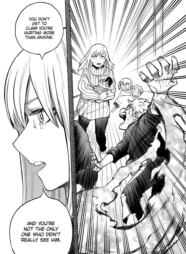 I think that Rei also played a part in it by not trying to help Toya. She didn’t give him as much attention and love as the others, but for a different reason than Enji. She didn’t want to see the darkness in her eldest son- the same darkness she saw in her husband- that she stopped looking altogether. Enji may be at fault here, but Rei played a part in it too. As I’m sure we’ll touch upon next chapter- should Horikoshi continue this part.