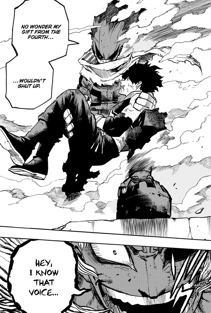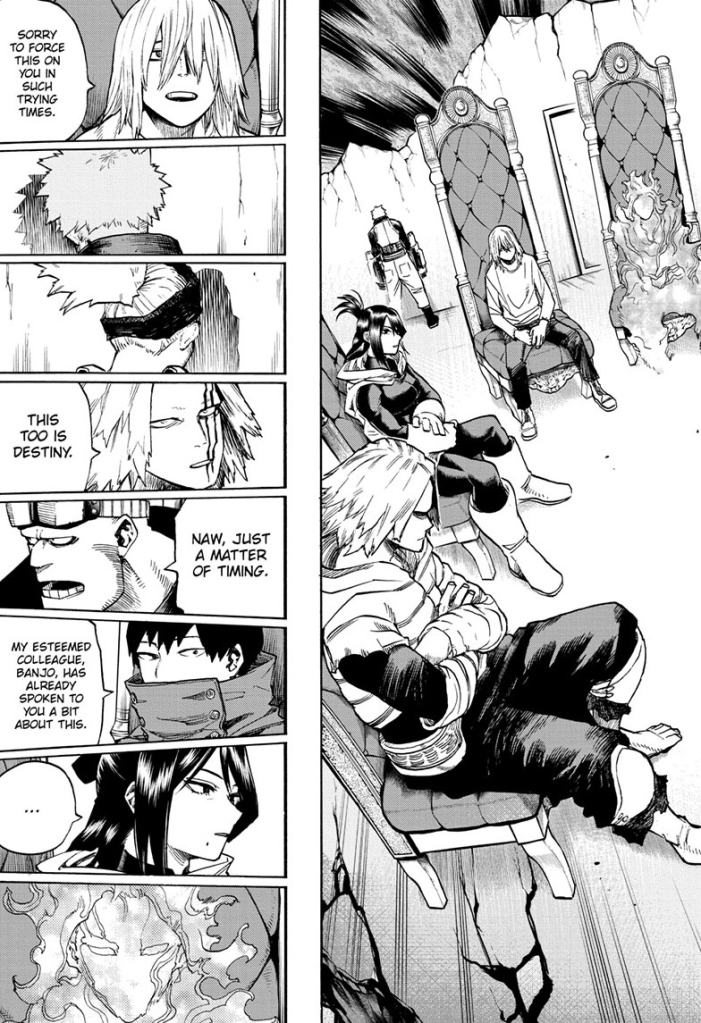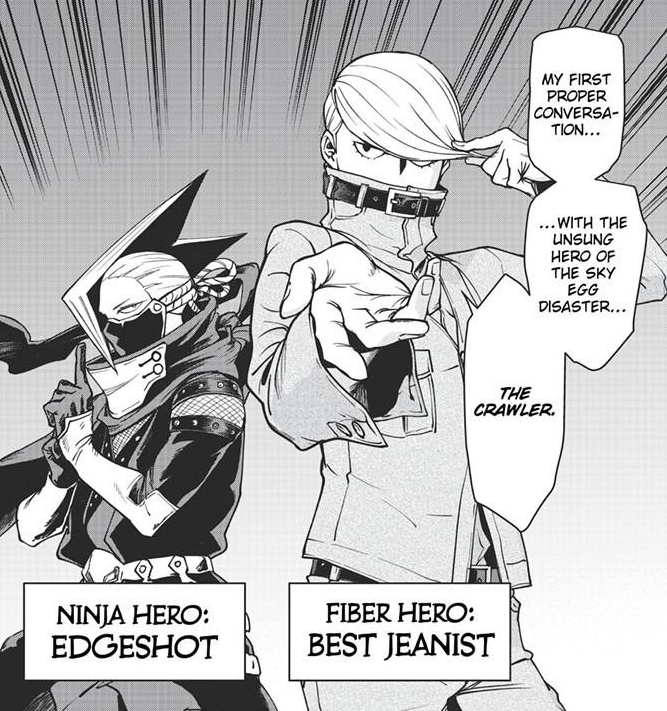 No, I’m not talking about Ketsubutsu Academy’s Yo Shindo AKA Grand or Tatami Nakagame AKA Turtle Neck. They were useless in this chapter. Sure, it’s great seeing them again. And by their character descriptions we know they’re 3rd years, meaning U.A.’s Class 1-A is officially in their 2nd year at the school. Nice. Things have changed and Horikoshi seems to be slowly showing us just how much is different at our favorite hero school…by not showing anything at all.
