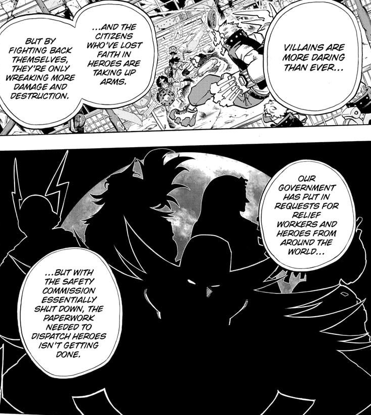 So, yeah. The country’s gone to sh*t but the top 3 heroes in the country will untie to fix things. That’s quite a bold move and sends a clear message Endeavor, Hawks, and Best Jeanist aren’t playing around. It also sends a wave of much needed hope throughout the public who many I bet feel abandoned by a large number of heroes quitting and the rise of crime. It won’t immediately fix the situation, but it’s a start.