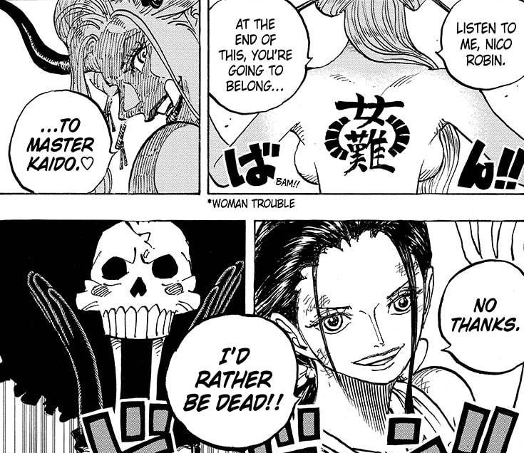 What was I talking about again? I keeping getting sidetracked. Yes, the Robin fight. Of course! So, yeah, Robin teaming up with someone against Black Maria is a bit disappointing but I’m glad it’s with Brook. I love Brook too! He’s so damn funny. And, if this chapter is a preview to what we can expect, this upcoming battle will be both exciting and hilarious. Robin and Brook, what a great team. I seriously haven’t been looking forward to a fight as much as this in a long time. And, yes, that includes Luffy VS Kaido.