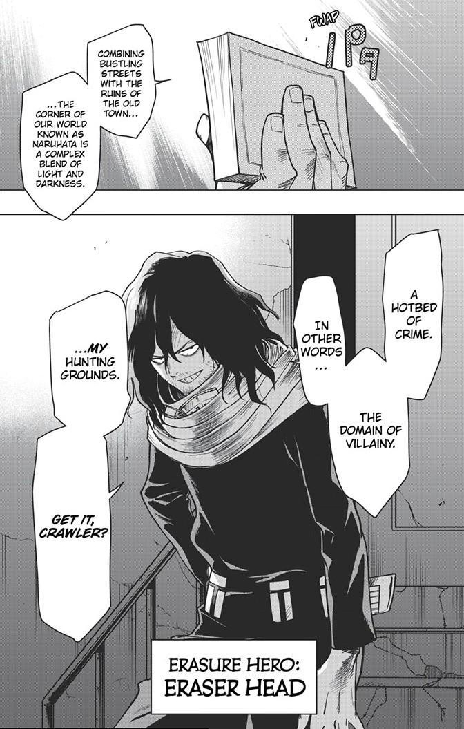 This was a wonderful chapter! We got to see The Crawler testing his skills against some well-known heroes and even though he would’ve lost to Best Jeanist and Edgeshot if they were fighting seriously, just to casually escape two Top 10 heroes makes Koichi look like quite the powerhouse himself. Hmm… I wonder what book Aizawa was reading? Let me just zoom in and… Kardashian Konfidential!? How could you, Aizawa!