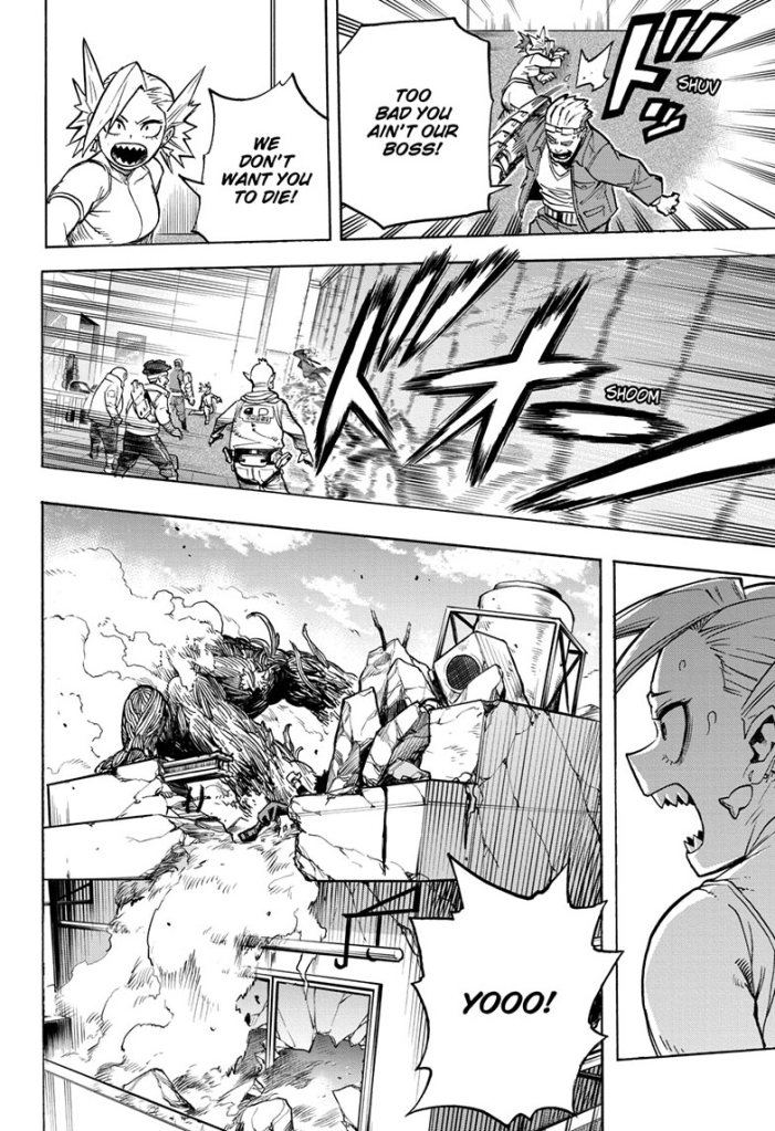 This was an okay chapter. It moved the story forward. That’s about it. Evacuating civilians into highly secure hero campuses is in full effect and naturally, we have those who think they can fight off villains themselves. Or, at least, think heroes can’t do it, so it’s up to them to find a way. We also get a Ms. Joke mention. I think she’s alive, Y’all! No one made a sad face when talking about her. Yay! I love you, Ms. Joke. Dump that Erasure zero and get yourself a hero! No, wait, Erasure Head is a hero. Damn it!