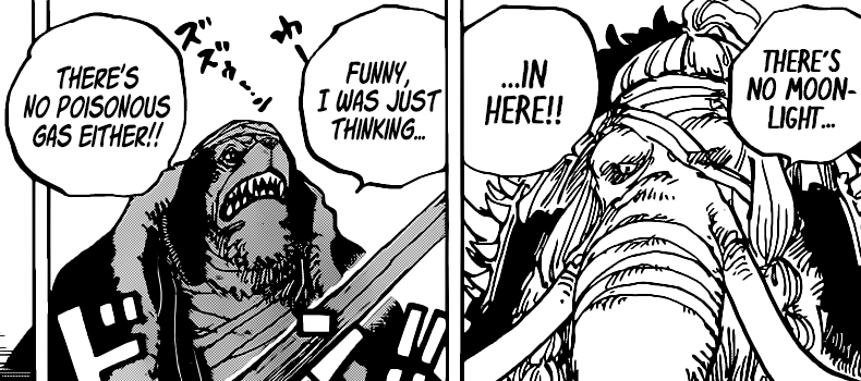 Looks like Momonosuke’s got observation haki up the wazoo. He can sense Luffy’s status (from fighting Big Mom and Dracula on steroids) on the roof from all the way where he is (which I assume is far). Cool, I guess. Probably an indicator he’s gonna be powerful as an adult. Yay, I guess.