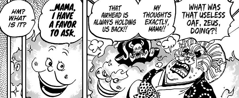 Big Mom may take a little time for herself to fulfill Prometheus’ request. I bet the little hot head wants Big Mom to make another homie and get rid of Zeus. Hmm… Can Big Mom unhomie a homie? Have we seen that? I guess there’s no reason to believe she can’t. Not that it matters. Oda already gave us a taste of Nami and Zeus working together. I bet it’s all leading to their reunion tour.