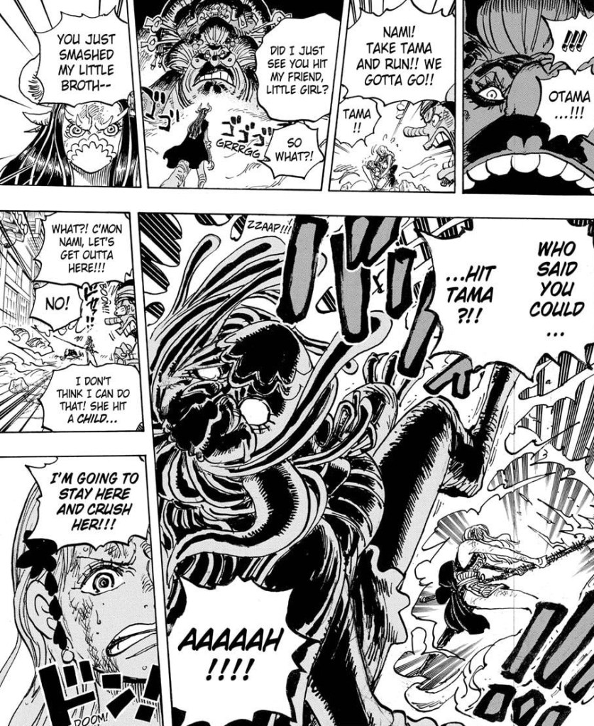 Big Mom’s there too. This could all be Oda simply ending the chapter on a high note then washing away the moment with Big Mom stepping in and Nami doing something later after Zeus permanently becomes her partner. Either way, I hope this is the last stop for both Page One and Ulti. I really don’t care about them.