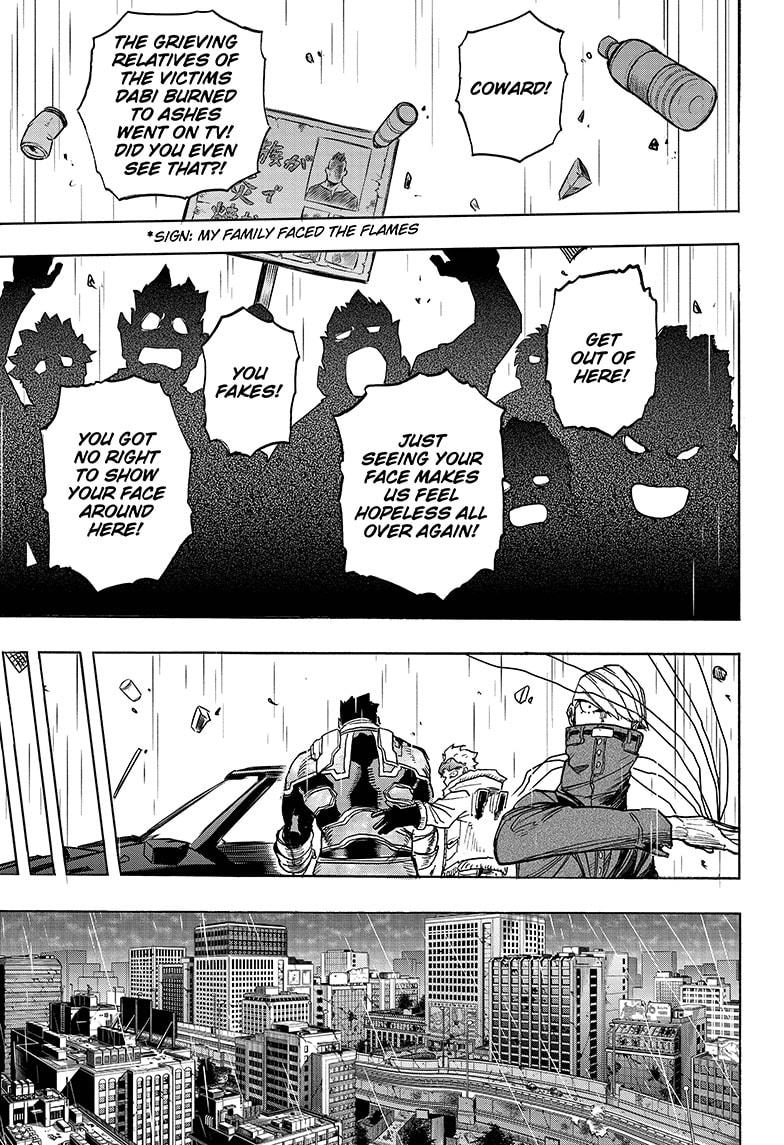 We have confirmation Detnerat is making weapons for convicts. I’m glad that plot point’s finally paying off. And are they building weapons at the same location Skeptic is manipulating public opinion? Yeah, I said it. I think Skeptic’s fanning the flames of hero mistrust online, one way by spreading the knowledge Shigaraki is after someone specifically. Hm? But if that’s true, then why doesn’t Skeptic just flat out say it’s Deku? Maybe I’m giving the guy too much credit and the public is just looking for heroes to blame instead of the villains who caused this mess.