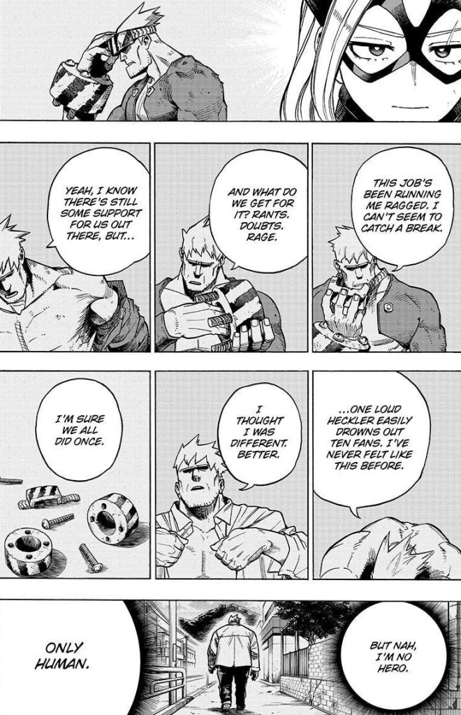 Loving the hero/villain relationship between Crawler and No. 6. Both are speedsters, one modeling himself after All Might. The other, born from All For One’s evil ambitions. The two even look like similar to their morality adjacent mentors (Koichi’s costume and No. 6’s no-face). Not to mention, learning No. 6 modelled his Rokuro Nomura face after Koichi’s! It’s so fascinating watching a glorified sociopath wanting to become a hero go head-to-head against an overly sympathetic vigilante. This alone makes this arc one of my favorites of the entire series.