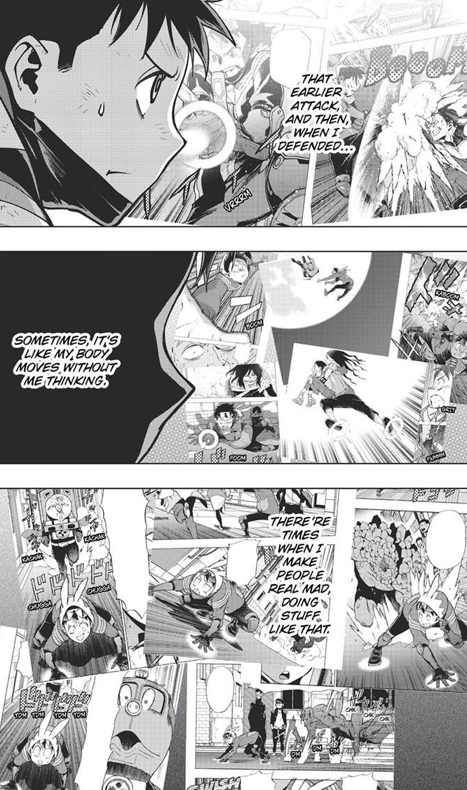 This was good chapter! I’m loving how the fight’s going and can’t wait to see more. Let’s see… Bombify, Detonation, Regeneration, Overclock Electromagnetic Waves, and Cellular Manipulation. Six quirks for Number 6, ha! But…what if his real name’s Number 7? He’s got one more quirk! Look out, Koichi! AHHH!