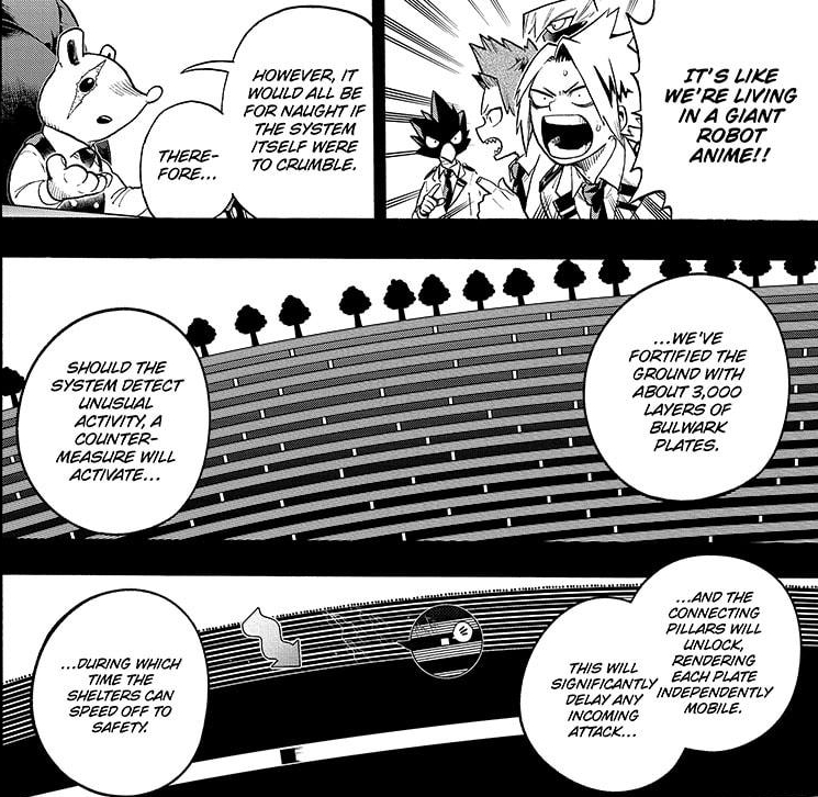 We learn more about the U.A. Barrier. It’s pretty impressive. Took a couple read throughs and google searches (What the heck’s a maglev and bulwark?) to finally understand. At the very least, those ungrateful masses should be safe. But, it makes me wonder just who is Nezu?