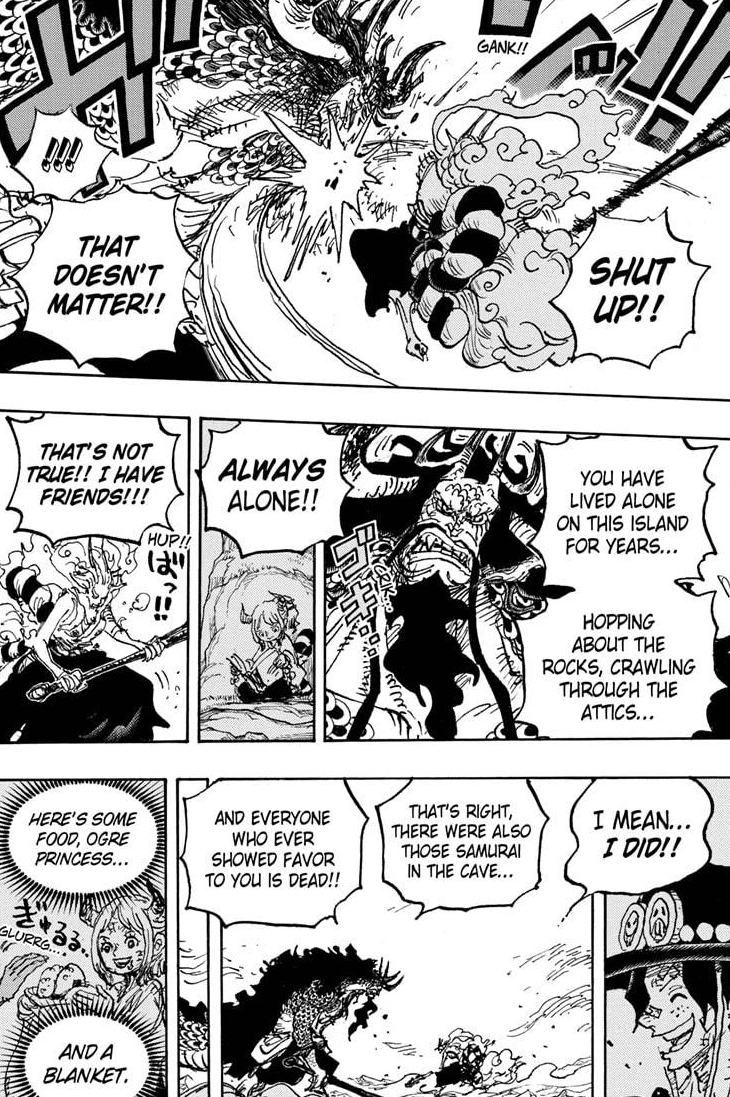 Next, we have confirmation both Kaido and Yamato are ogres. Where is Oda going with this? I’m not sure. Is there an ogre island out there on the Grandline? Guess we’ll have to find out because I doubt this arc will be the last we see an ogre, even if it’s in the flashback of an upcoming arc.