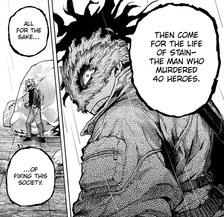 Stain’s hero kill count is now at 40. Yikes! No doubt he’s been going after former heroes who quit after the Paranormal Liberation War. Death Arms? Yoroi Musha? I wonder if they’re still alive?