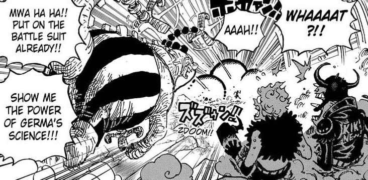 Sanji. His Germa genes are in full effect! That’s…about it. The only question is what triggered it after so many years? Probably the raid suit. Well, that was easy. I wonder if Sanji will wear it against Queen. Hmm…yes. With Queen’s connection to Judge and intense desire having Sanji wear the battle suit, it seems fitting for the fight to go that route near its end.