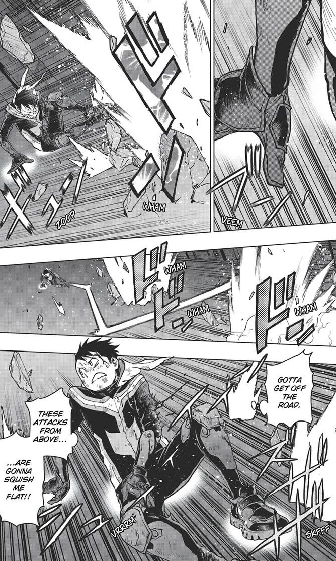 Koichi can’t fight anymore. He’s got a busted leg, arm, and ribs. His only option is hiding and waiting for heroes to show up. Remember them? Best Jeanist, Edgeshot, Ingenium, and Aizawa? Geez! What are they doing?! Okay, okay. Some could be hurt from the Anons’ attack. Then there’s keeping the public calm and trying to establish communications with anyone outside Naruhata. But Koichi and No. 6’s boom-boom aerial fight is pretty hard to ignore, plus it’s being broadcast on the news so someone has to be coming.