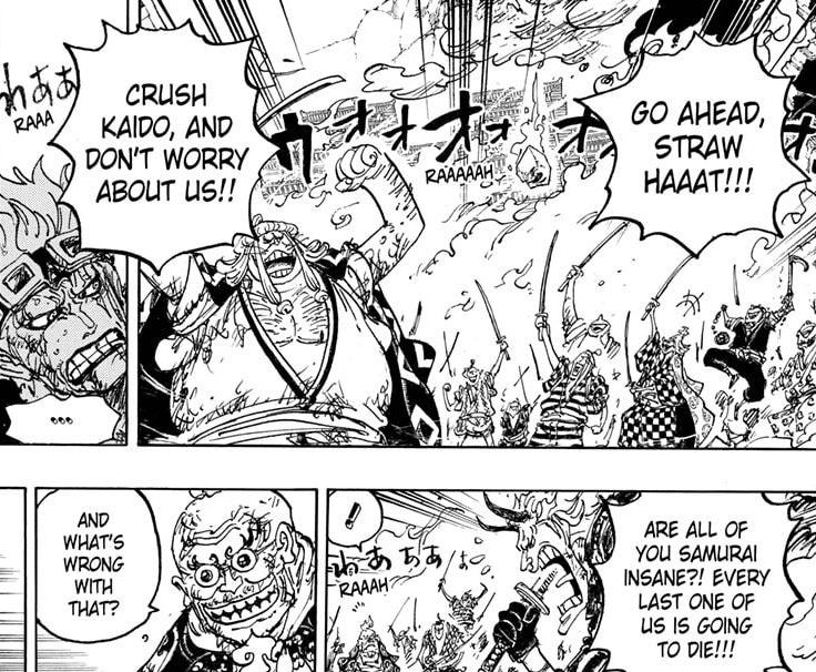 All the signs are there it’s ending. We get major focus on the citizens of Wano, including the samurai. You’ve seen it before. The current island residents put all their faith into Luffy, building up hype before the arc villain goes down for the count. Momonosuke’s got screen time too. His purpose is saving everyone in Onigashima and the Flower Capital. The hype meter’s filling that moment up too. So, is the next chapter the one that ends it all? Well, there’s still Orochi… Damn it… It maybe another couple of chapters, or Oda quickly gets everything else resolved, revealing Kaido’s final whopping as a two-page spread at the chapter’s end. Fingers crossed!