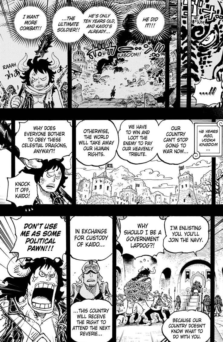 Too bad it ended kinda anti-climatically. Oda did the classic flashback before the end maneuver. That’s fine and all, but it wasn’t worth the wait. We saw why Kaido became a pirate and more of his ideology. Basically, he hates those who rule the world and want to destroy those unfair powers that be through his survival-of-the-fittest policy. Gotcha. But…that’s it? I don’t know quite how to describe it, but that flashback simply left me wanting more. MUCH more.