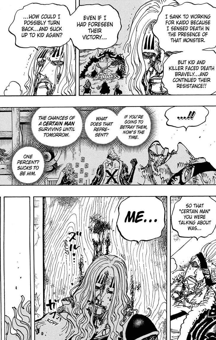Ashura, Izo, and Hawkins are indeed dead. Wow! Ashura, yeah. But Izo and Hawkins? I didn’t see that coming. Bummer, but I’m glad a fight against Emperors leads to well-known characters dying. It makes them that more dangerous.