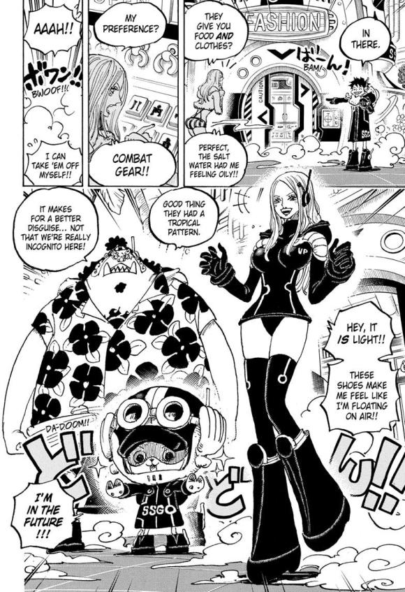I know One Piece is written for Japanese boys but can you at least make Nami and Robin’s “future suits” cool looking? They’re as basic as you can get. It’s like you put all your artist points in making them look sexy but forgot about style. Oh, well. I’m sure your target audience will enjoy reading this chapter with one hand.