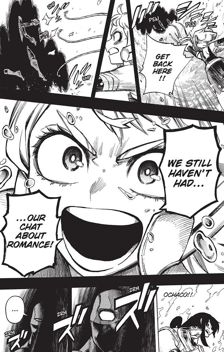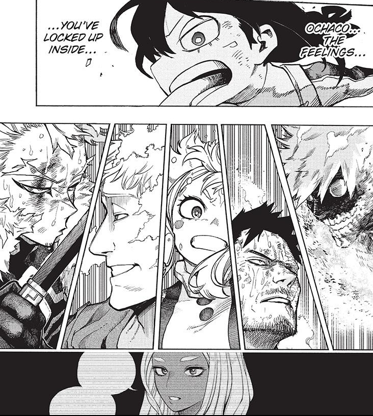 I figured Horikoshi would give us a flashback explaining what happened at the end of the last chapter, but I didn’t expect this chapter to be so boring. Yes, I’m bored. It’s Toga’s fated fight against Ochako and I’m bored. We barely saw Toga and Team Ochako fight on Okuto Island. I guess it doesn’t matter since nothing interesting happened except Toga drinking Twice’s blood. This is the final arc, Y’all. Why is this boring?