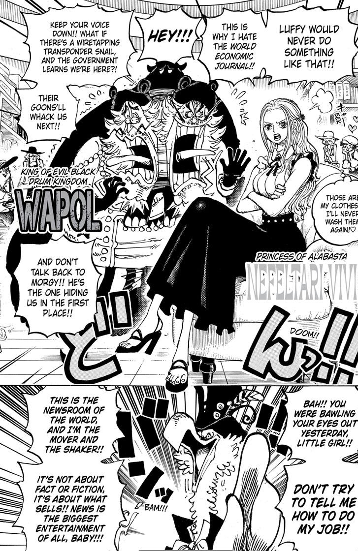 Nefeltari Vivi and Wapol hiding from the World Government at World Economic Journal HQ. Interesting. We all know something huge went down at Marijoa. One fan theory being Sabo, Vivi and Wapol caught a glimpse of the King of the World, Im. Works for me. Especially with Vivi and Wapol hanging out with Big News Morgans. Can you imagine the chaos that’ll result from Morgans printing a worldwide expose on Im? That’s a story plot point that could only happen in One Piece’s endgame. And guess what? We’re in the endgame, Y’All! The only question is when this info bomb drops?
