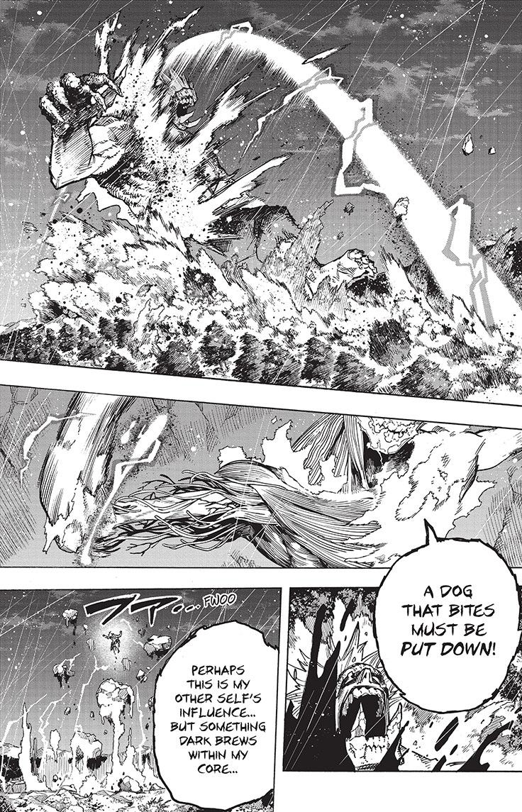 “Blah Blah my darkness made me stronger blah.” No, my evil overlord friend. You’re already evil! Growing younger didn’t somehow make you more evil. Here’s what happened: You were pushed into a corner and your quirks evolved. That’s it. Quirk evolution through training and dire circumstances was something established in this universe long ago. Geez, All For One. Save the drama for your YouTube video essay channel.
