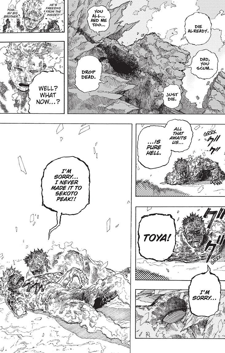 *Sigh!* I guess that’s it for Dabi. Why am I sighing? I don’t know. I liked the entire Todoroki family being there. And… That’s it. Not to say I hate this chapter. I don’t. I’m just indifferent. The entire family came together to stop Toya and I just don’t care all that much. Like Shoto’s quirk, I’m half-hot/half-cold about this entire final arc. This is part of the cold patch.