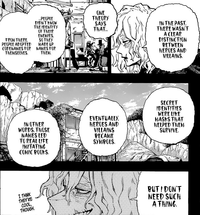 I like how Tomura was the one to drop lore like that; it showed that All For One was actually teaching him a bit about the history of the world after quirks started popping up. And I was always curious why he and Toga never choose Villain names of their own. Heck; I don’t even know what they would choose!