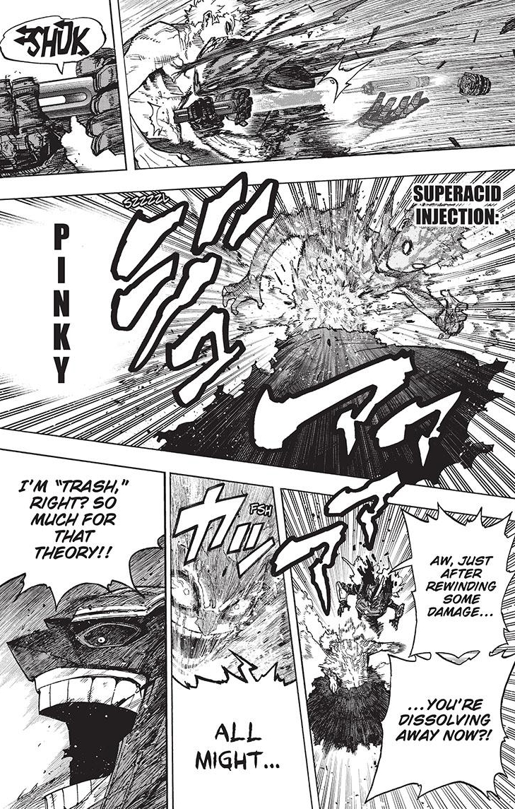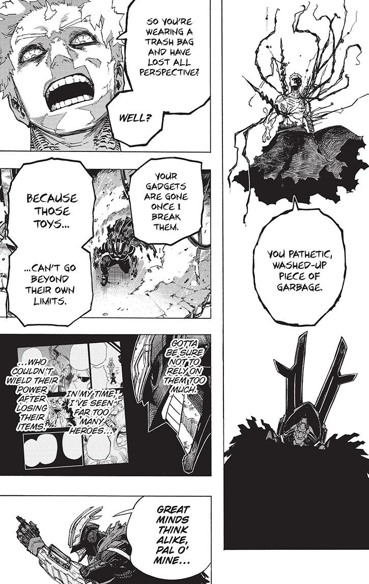 More fighty-fighting between All Mech and All For One. I’m not surprised AFO’s gaining momentum. You all know how most shonen fights go: One side’s winning, then the other, then back again, La-Di-Da…someone wins. So don’t worry All Might fans, Toshinori still has plenty of Class 1-A quirks to adapt. I’m sure Bakugo and Todoroki’s quirks are getting some love. What I really want to see are Mina and Aoyama’s quirks adapted. AFO getting an acid shower and laser to the face would be so satisfying!