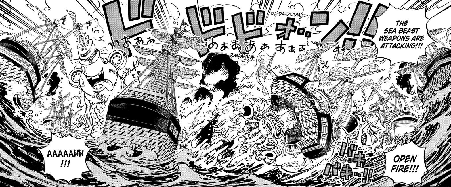 Bye-bye, Sea Beast Weapons! Watch out, Navy. Animal-cyborg rights groups are gonna flip out once they find out. Talk about a PR nightmare! But, at least the Navy now controls of the PX-IIIs. Guess we’ll see them again during the final war playing a similar back-up role like the OG Pacifistas during the Marineford War.