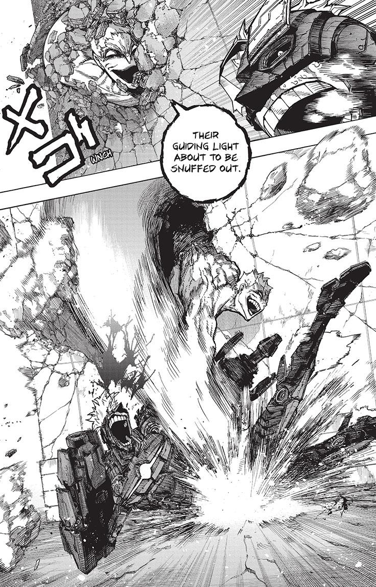 The All Mech/AFO fight is still great. There aren’t many Class A quirks left for All Mech to use. I can see this battle ending in a two or three more chapters, depending on chapter length, flashbacks, etc. And, yes, I still think this fight ends with a double K.O. Or a triple if Stain intervenes and he probably will. Come on! You didn’t think the Hero Killer’s getting a happy ending, did you? Hmm… Thinking about it, Stain would be fine dying alongside his favorite hero. Oh, well.