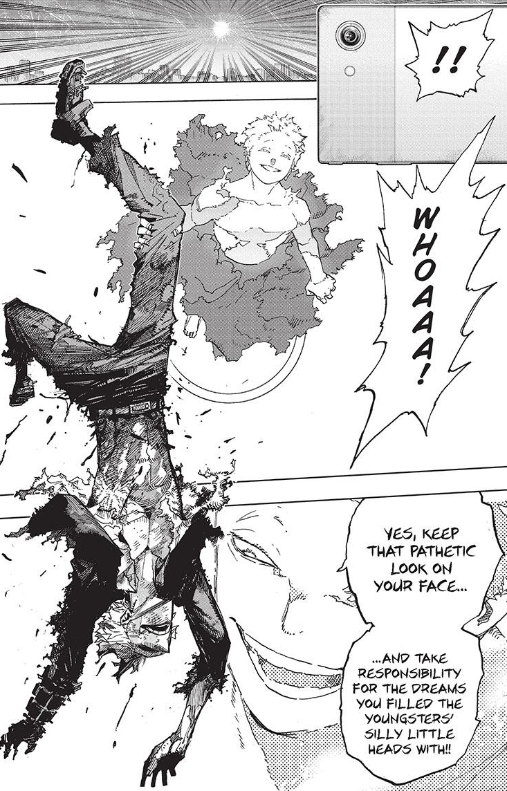 Yes, All Might’s dead, but he should be joining the Force—erm—One Fore All vestiges soon enough. The ole’ dead mentor encourages the hero trope is coming. Or, is he? Without a quirk of his own, is All Might’s connection to OFA severed forever? I doubt it. If only for narrative purposes. We’ll see “All Might” talking to Deku again.