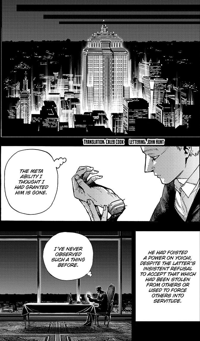 Yes, it is. But, in any case, it’s great we finally got to see AFO’s origin. And, surprise surprise, he was always evil. Actually, I’d rather we gotten more focus on the OFA Users. AFO’s a one-note villain, but all the OFA Users seem interesting. Was Yoichi enjoying his life away from AFO? How did Kudo and Bruce meet? What the heck is Nana Shimura’s hero name?There’s lots of unanswered question that I think Horikoshi isn’t gonna answer this late in the series. Frankly, I would’ve loved an entire arc focused on AFO and the OFA Users.