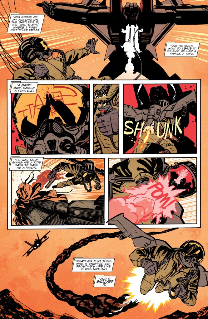 What we see in this issue is a great soldier mentally broken from his near death experience and his quest to find answers as to where this murderous robot jet came from and who made it. At first, I thought this would lead to more Transformers interactions but it doesn’t. And I think that’s for the better.