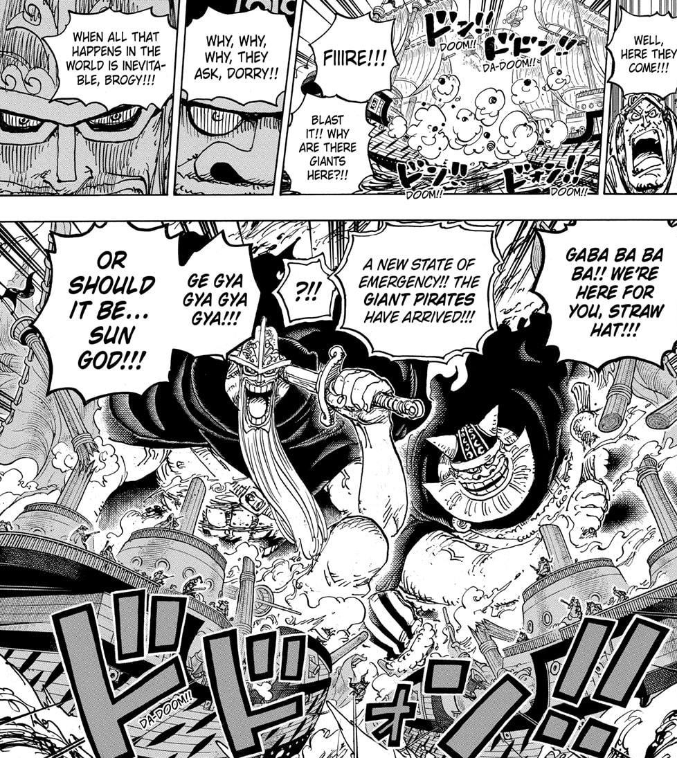 It’s the Giant Pirates! Talk about a surprise! And it looks like Dorry and Brogy are there for Luffy. Why? It’s gotta be for more than just helping. I assume whatever the reason is will lead the Straw Hats to Elbaf.