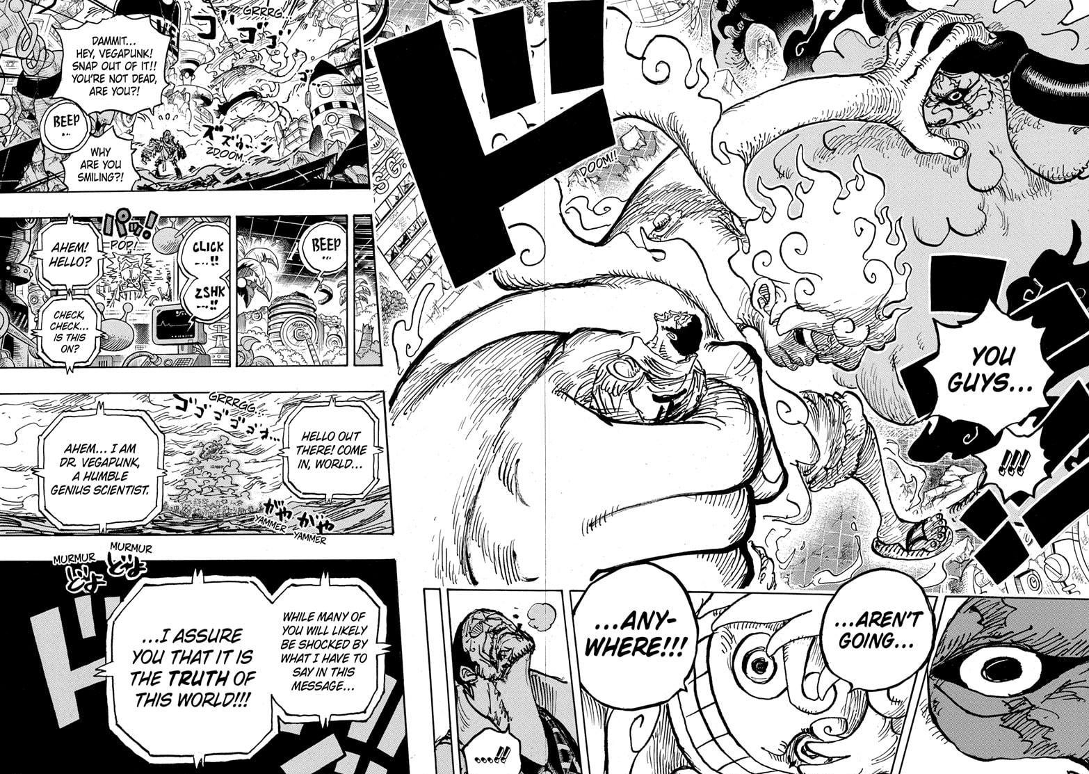 Dead tired, that is! What a busy week he had! Oh, and Dr. Vegapunk: Stella Edition is dead. For real dead. Real/Fake Dead. Fictional Dead. You know what I mean. In any case, Dr. Vegapunk was smart enough to come up with a plan to stick it to the World Government if he did indeed die. And it looks like that plan involves broadcasting a pre-recorded Ted Talk revealing everything he knows about the history of the world. And, also how to overcome stage fright, but let’s focus on the former, shall we?