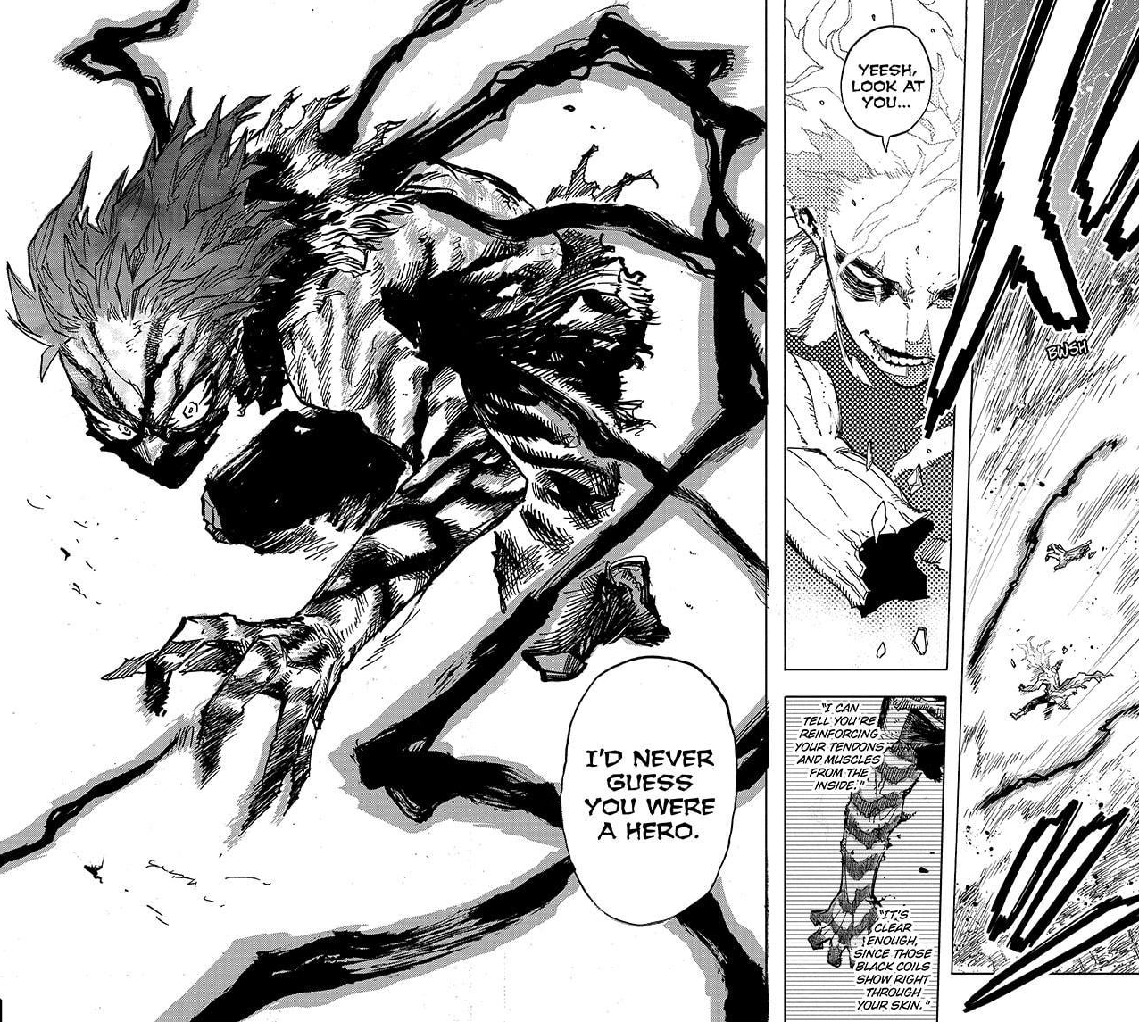 This was a good chapter! The battle’s going in a direction I never considered and I’m curious as to what happens next. Let’s just hope Shigaraki doesn’t stop Kudo’s attack then snorts Gearshift like he did Danger Sense. Just Say No to quirks, kids. Because No-ing is half the battle! ♫My He-roooo!♫