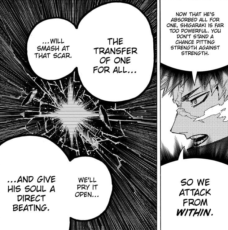 Anyway, for Kudou’s insane plan to work, his spirit, along with his quirk, must be flung hard enough at the ashy Shigaraki for it to be destroyed on impact. Thus, denying Shiggy the use of Gearshift. Yikes! If successful, could this lead to Deku losing all of his bonus quirks? It all makes me wonder what will become of OFA by the end of the series, especially if Yoichi dive bombs Shigaraki. Who knows what will happen to the base OFA quirk if he goes. Heck, if he represents OFA itself, then he could end up being the only User spirit left.
