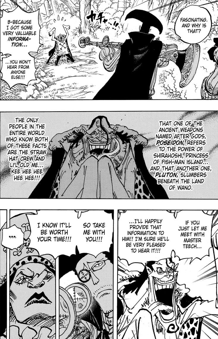 Hmm… Dr. Vegapunk’s about to reveal World Government secrets. Big New Morgans has dirt on the World Government thanks to Princess Vivi and Wapol. Interesting. The World’s most famous and smartest scientist and the biggest news publisher in the world. Two trusted sources of information both spilling the beans on the WG at (I will assume) roughly the same time. If that doesn’t convince the Five Elders and Im to get York The Greedy on their payroll so she can get Uranus operating at a constant 100% efficiently, I don’t know what will. My York-Joins-Blackbeard-Theory may be as dead as… VP Stella now.