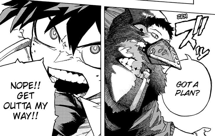 I think I get what Horikoshi is going for with Deku and Tenko. As we see Tenko evolve into Tomura- we see the quirk and the user align in their goal- we see Izuku’s vestige trying to reach them, becoming that boy we saw at the start of the story; the kid who just wants to be a Hero.