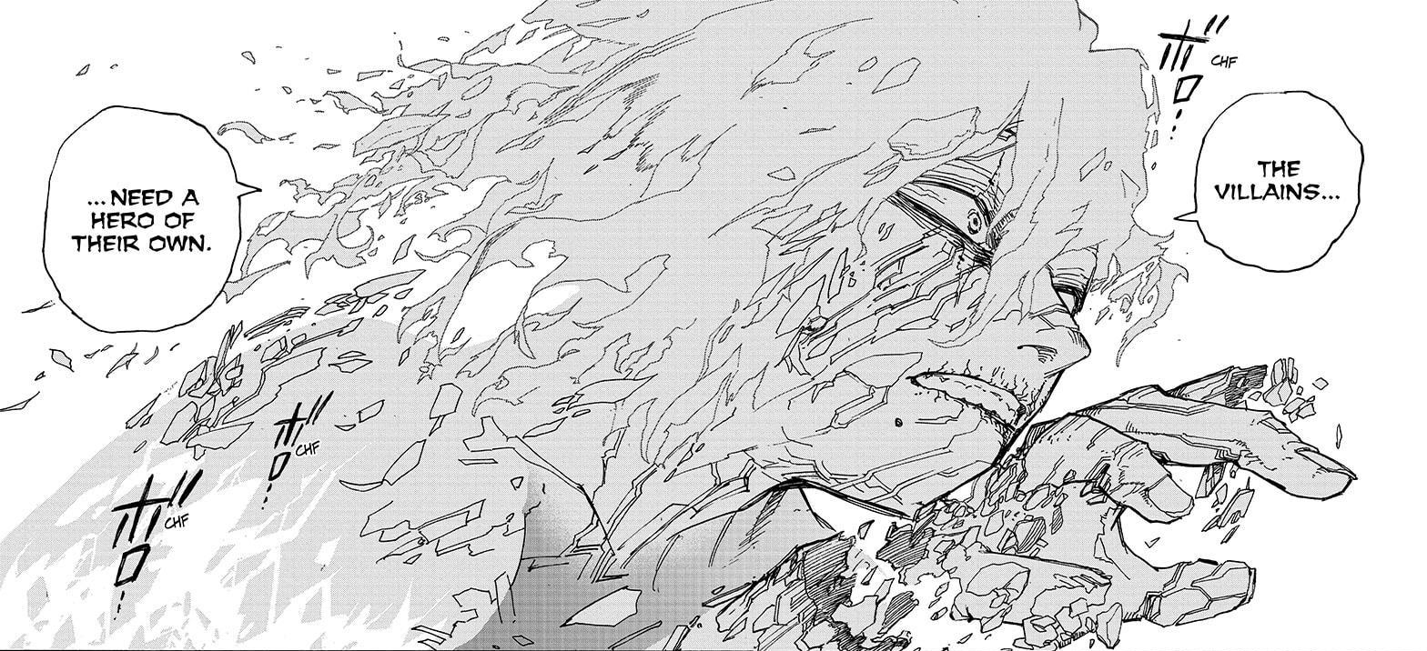AFO, the Big Bad who refuses to die. I really wanted Shigaraki to defeat AFO instead of All Mech & Friends, earning his place as the final villain. But that, like Beyonce attending my birthday party last year, never happened. And, that’s fine. My predictions are always a toss-up, but I wanted something better. Better than having AFO’s vessel return. Better than it revealing AFO’s completely behind Tenko Shimura becoming Tomura Shigaraki down to the tiniest detail. Maybe I’m overreacting and Shigaraki will wrestle control back from AFO, but that won’t undo what’s being setup in this chapter. That AFO, once again, is the biggest baddie bad boy of My Hero Academia.