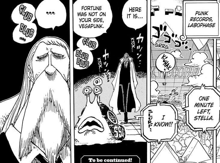 We get what I believe is our first look inside Punk Records. The transmission transponder snail broadcasting the worldwide message is inside… along with something else. With only one minute until Dr. Vegapunk snitches on the World Government—what could St. Mars be looking at? Well, I’m assuming that something is gonna prevent him from destroying the snail. Maybe another Vegapunk Satellite about the hatch from its tank? But, if so, how could they keep Mars from destroying the snail? Hmm…
