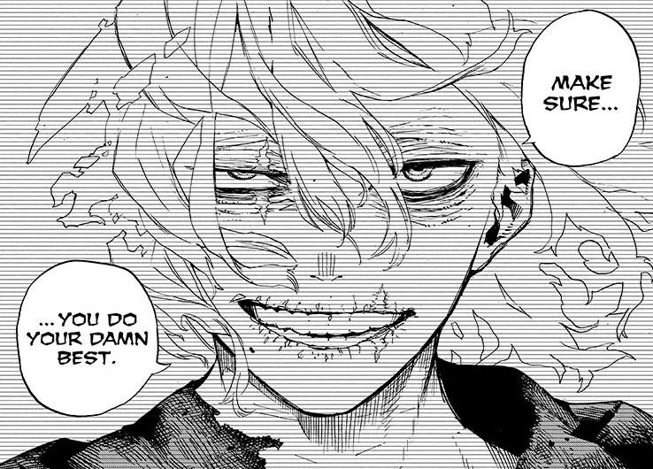 Deku. All he has is an ember of One For All. I don’t think he can continue being a hero with just that. At least, not the same kind of hero. We’re getting Gadget Deku, Y’all! Most of One For All’s supplement quirks can be adapted into tech. A whip weapon? Smokescreen pellets? Sure. Danger Sense and the others? Maybe not, but an advanced tech suit is all Deku needs for some kind of super strength. Hell, Captain Celebrity’s hero office can sponsor him! Basically, Deku will continue being a hero in someway. He won’t be the Superman of MHA, but he can easily become the Batman of the series.