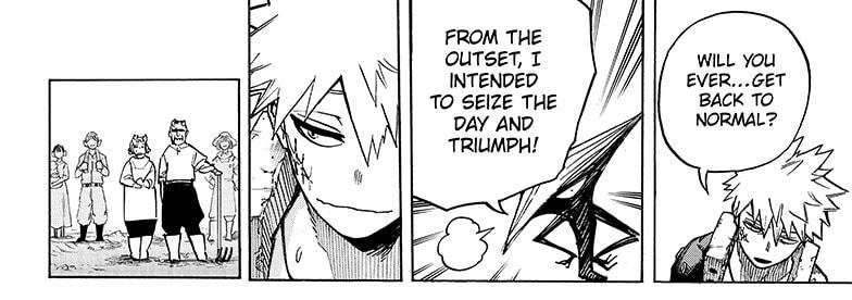 This was a surprising light hearted, slice-of-life chapter—mostly. I love seeing Class 2-A interacting with each other both in classroom and on a “mission” while just being friends. Shinso fits naturally into their dynamic along with a calmer Bakugo so much it makes me sad we won’t see much more of it soon.