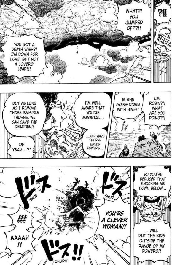 No, not Ronja! Her positivity in the face of death is heartwarming. She’s, by far, one of my favorite Elbaph characters in this arc just from this chapter alone. Prediction time: Sanji saves Ronja. Either him or Spider-Man. Hasn’t Disney bought Shonen Jump already? No? Sanji it is then.