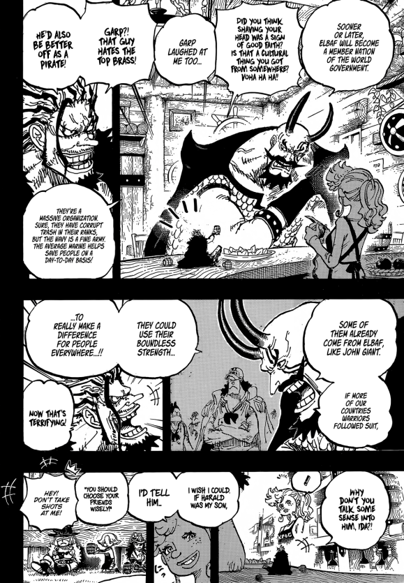 The Five Elders will allow Elbaph to join their shitty club if Harald kills Rocks. Naturally, that won’t happen because Elbaph isn’t currently apart of the World Government. Where’s Oda going with this? Are we to believe Harald does kill Rocks but those old bastards still don’t allow Elbaph in? Maybe. Depends on if Rocks is actually dead. But Rocks could’ve fake his death so…